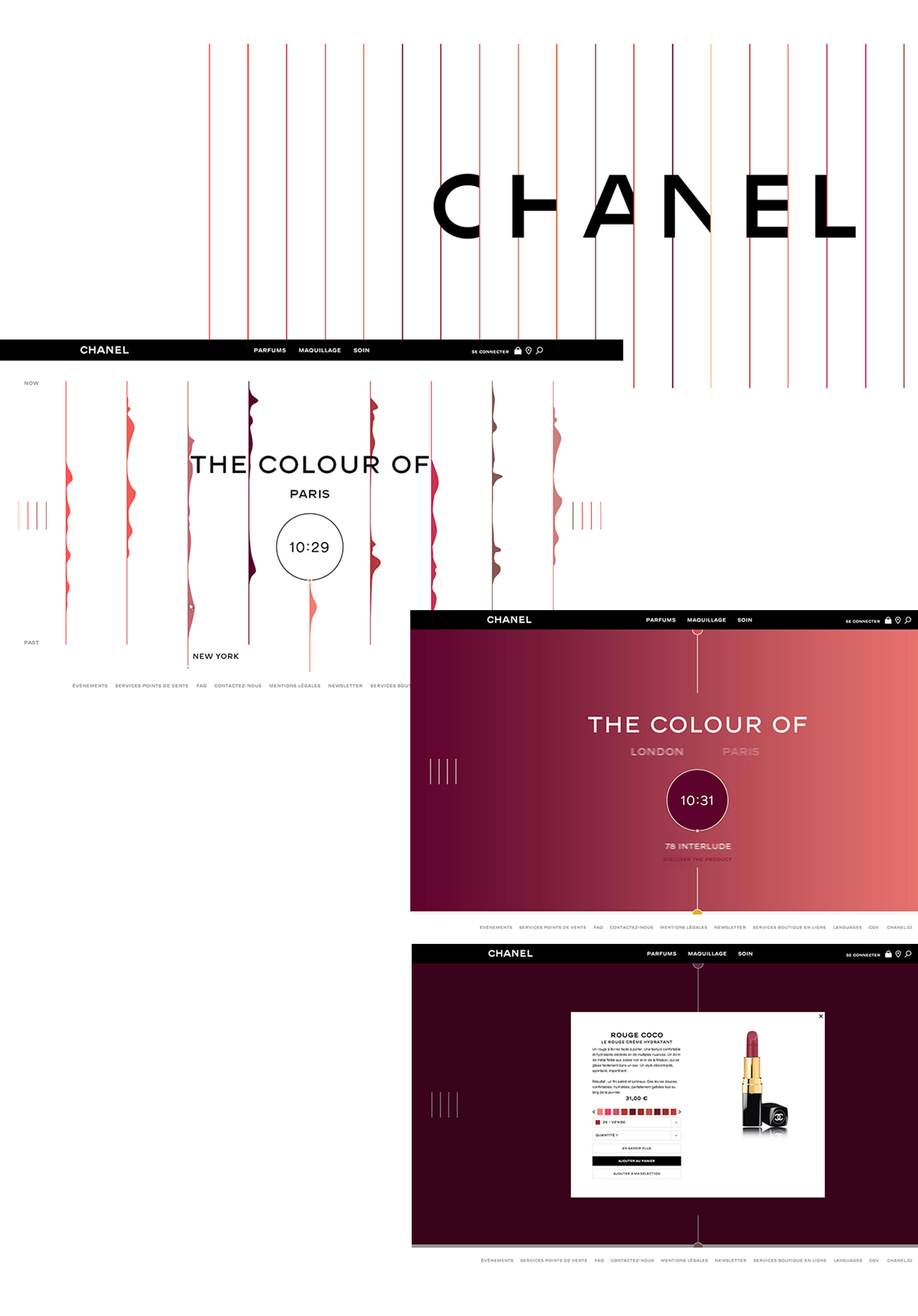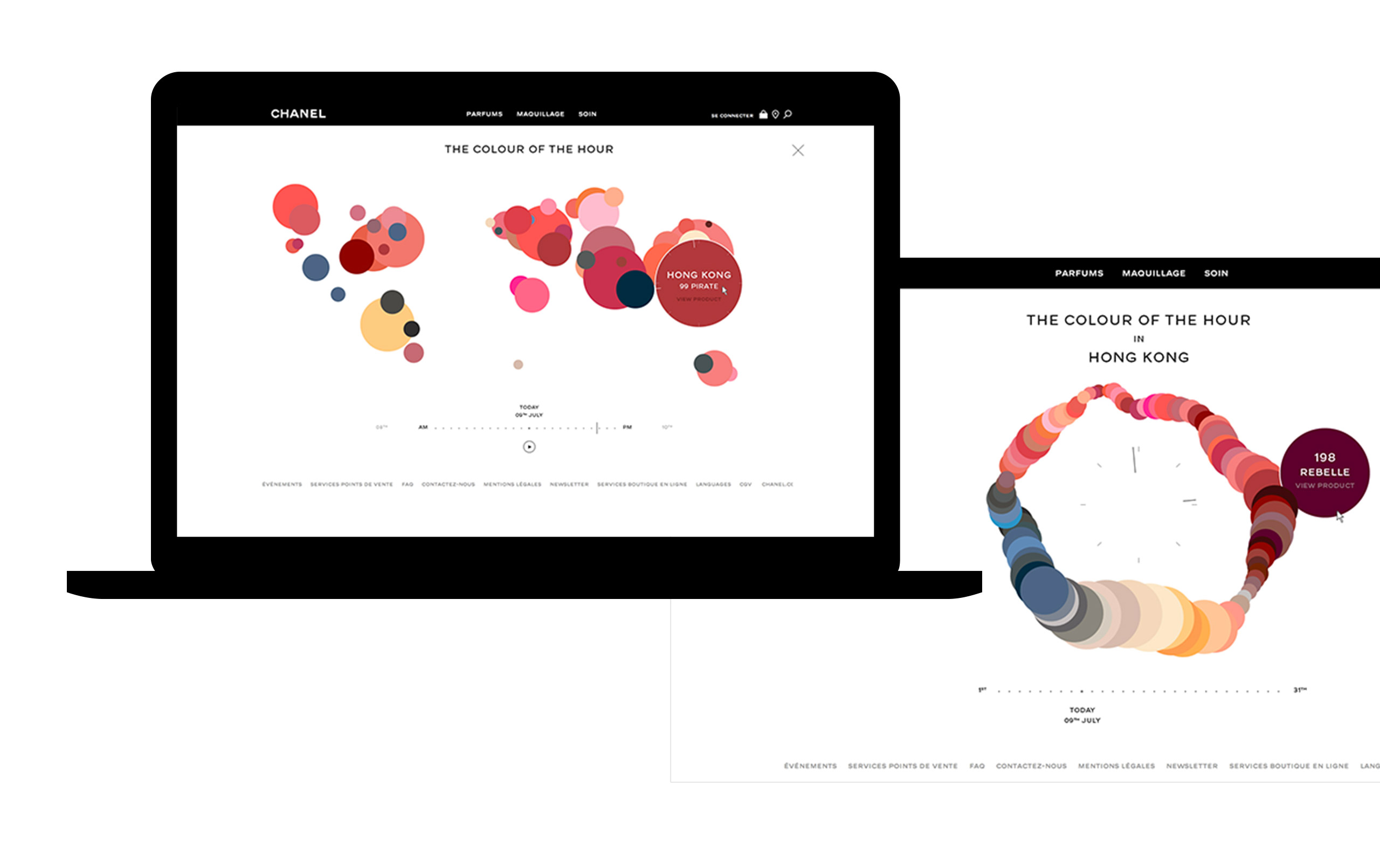 “The color of Paris” is a real time data visualisation project based on colorimetric data from Chanel’s e-commerce site, city by city, minute by minute, based on orders, impulse purchases or most popular colours.